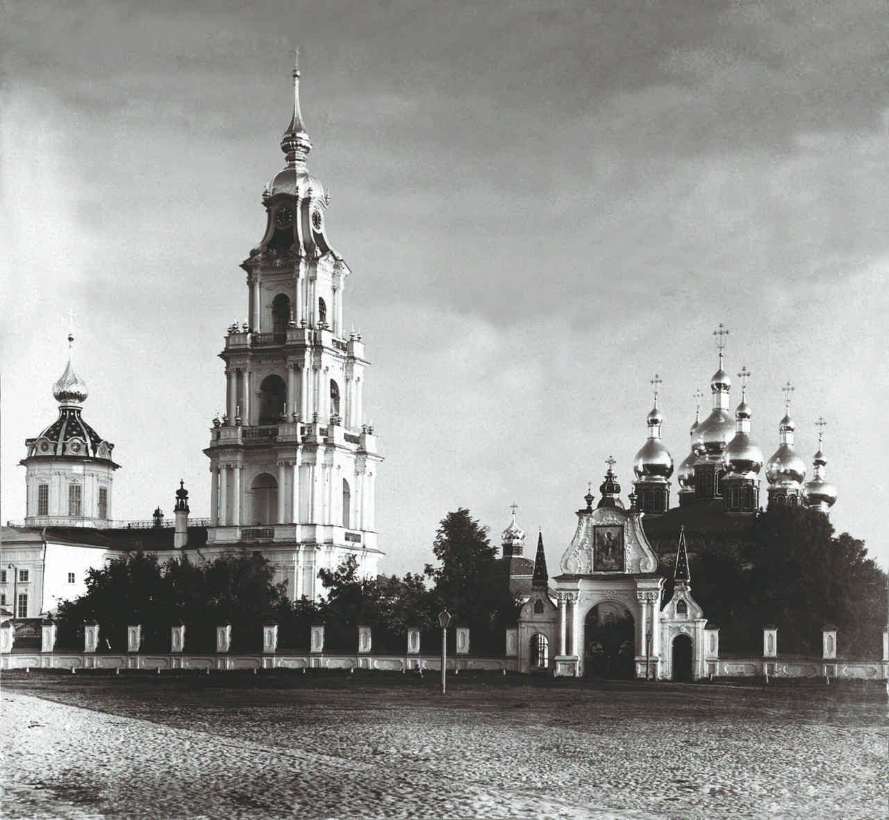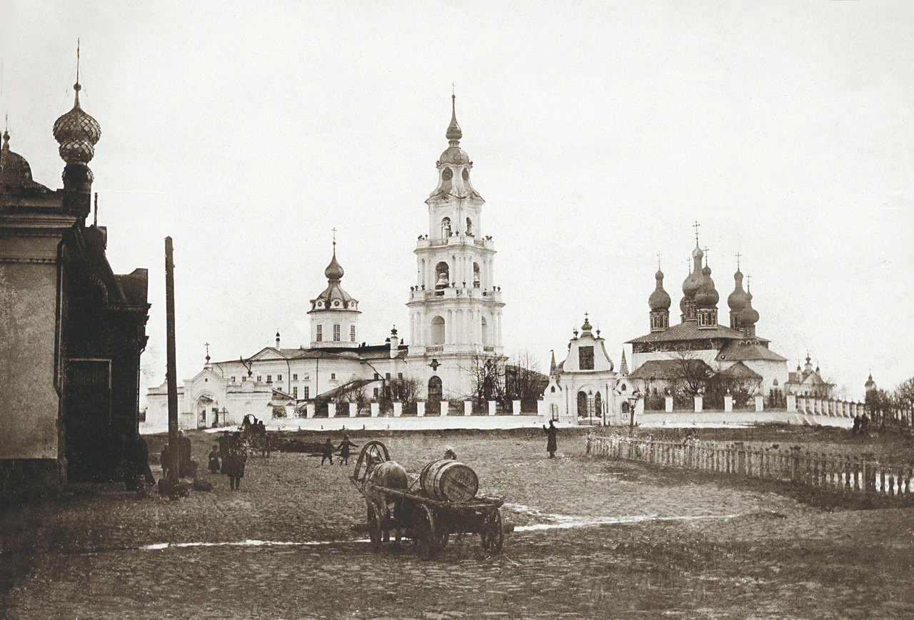 Вид соборного комплекса Костромы со стороны Сусанинской площади. Богоявсленский собор слева. Успенский справа. Фото С.М. Прокудина-Горского. 1910 г.