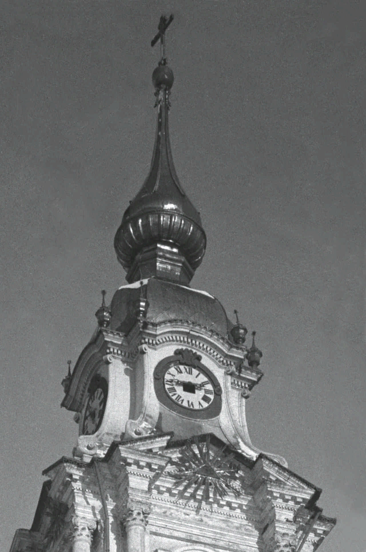 Более всего на образец указывает форма завершения – пятый верхний ярус с часами. Он был выполнен в характерной форме раскрепованного перевёрнутого колокольчика. Создался некий художественный контраст между капитальным, внушительным основанием и более лёгким завершением.