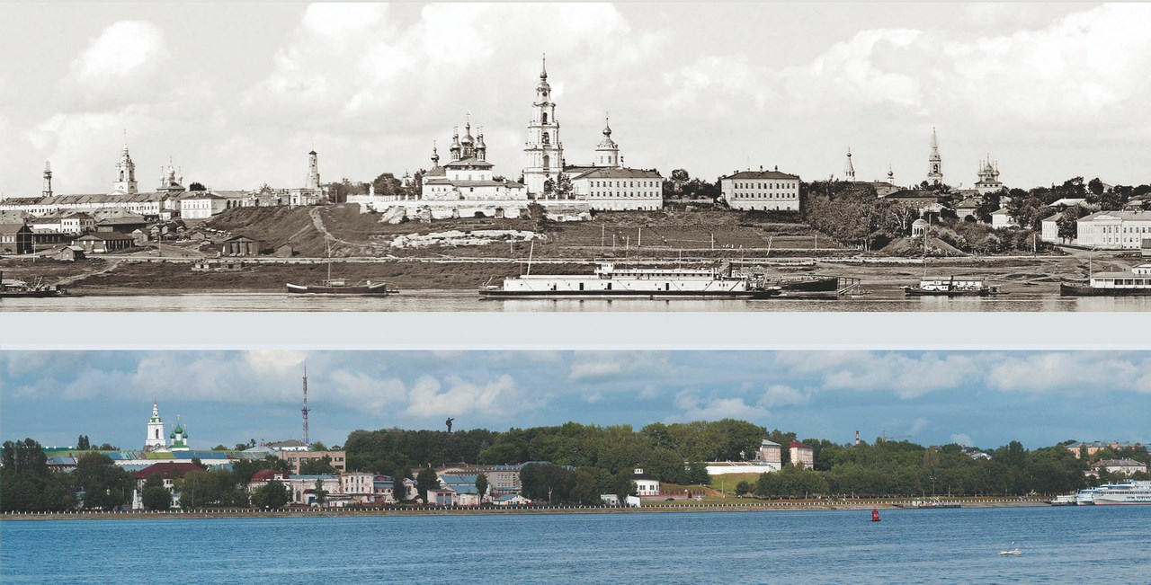 Вид соборного комплекса Костромы из-за Волги в конце XIX века и в сегодняшнее время