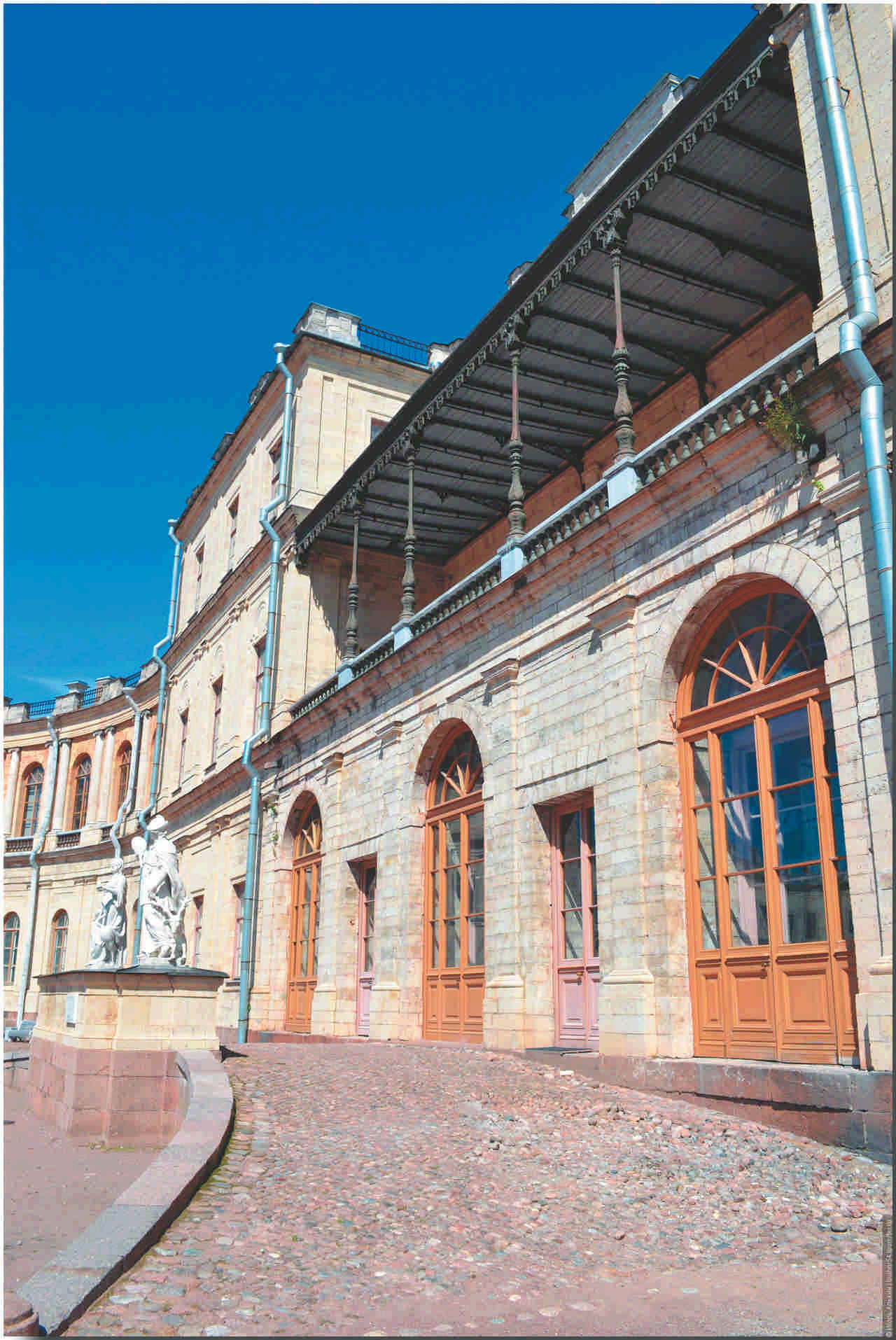 Окружённый диким садом, Гатчинский дворец с самого начала походил на крепость. Для его отделки использовался местный камень –пудостский известняк, придававший зданию жёлто-серый «крепостной» оттенок. Главный дом и примыкающие к нему флигели (каре) были выполнены в стиле строгого классицизма, без привычных для русского XVIIIвека барочных элементов. Эта особенность уже тогда обращала на себя внимание. «Усадебный дом нового вкуса, – отмечал современник, – прекрасен, без нагромождения украшений, без многочисленных статуй на крыше, без вздыхающих картиад, представляющих печальный вид мучимого и страдающего человечества».Башни, подземные ходы довершали картину средневекового европейского замка, перенесённого в окрестности русской столицы.