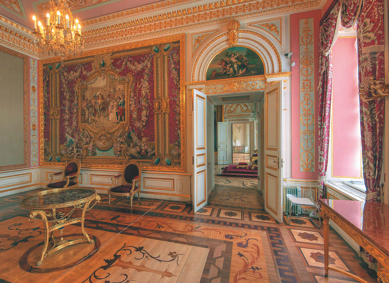 Рядом с Тронной Павла I Бренна создал насыщенную звучным колоритом Малиновую гостиную. Резная золоченая французская мебель, обитая малиновым бархатом в тон основному цвету гобеленов, дополняла архитектурный, лепной и живописный декор интерьера.