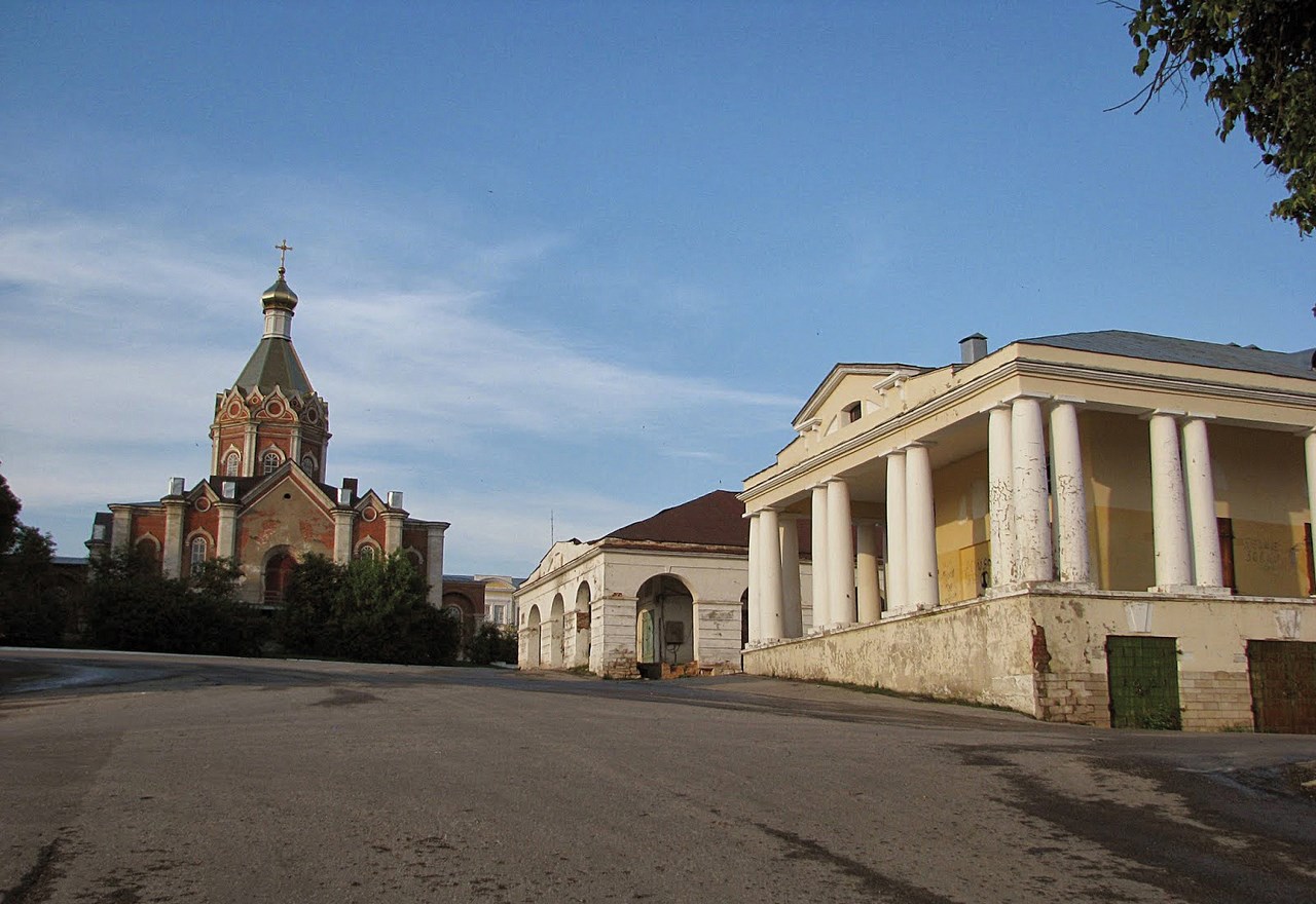 Желтоватые торговые ряды возле спуска к Оке давненько пришли в упадок и больше оттуда, видимо, не намерены возвращаться. Дорические колонны, как могут, скрывают мерзость запустения.