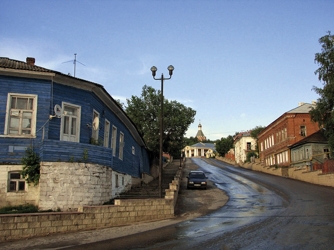 Неподалеку от торговых рядов, пришедших в негодность, как будто Христос выгонял торгашей именно в Касимове, на пригорке - маленький, светлый, но такой намоленный храм Николы, что хочется поселиться в нем и никуда не высовывать нос. Особливо, когда дождик барабанит по окнам тревожную дробь, как в цирке, когда гимнаст, повиснув вниз головой под куполом, уже готов стремглав упасть на арену. Хочется служить при церквушке попиком с жидкой косицей, петь громовым басом «Миром Господу помолимся» и пить водочку под квашенный огурчик.