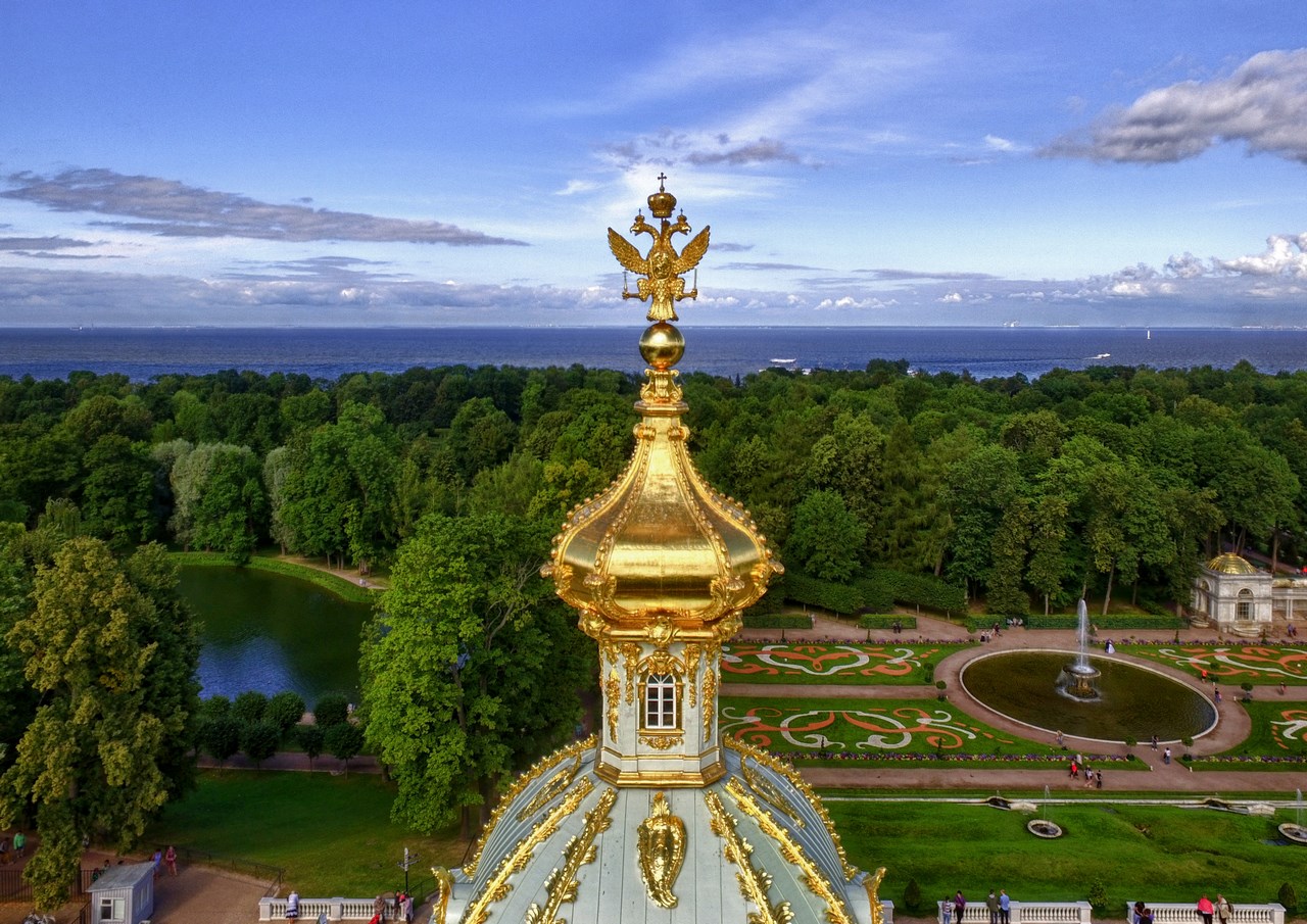 Луковичная глава Гербового корпуса вознеслась над просторами Петергофа, византийский орел взлетел, коснулся небесного полотна и державная праздничность гимном величия разлилась в вышине.