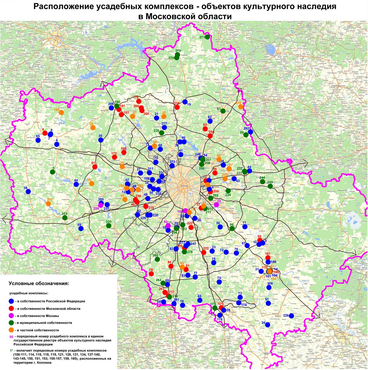 Еще мы учитывали тип собственности. При разработке стратегии сохранения и использования объекта важно помнить, что решающее слово здесь за собственником. В нашей градации по собственности выделены: собственность Российской Федерации, Московской области, отдельные усадьбы в собственности Москвы, а также муниципальная и частная. Вся собранная информация была нанесена на карту, и у нас получилась наглядная картина. Выделились четыре категории.
