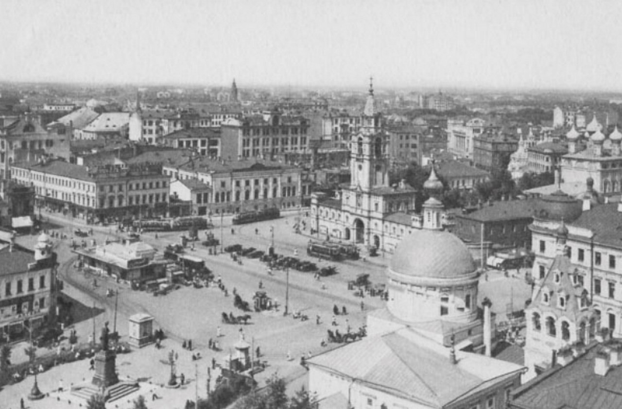 Последний лучший вид градостроительного ансамбля Страстной площади до слома Страстного монастыря, церкви св.Дмитрия Солунского, жилого квартала Бронной слободы и усадебной застройки на фотографии начала1930-х годов с дома Нирнзее, который и ныне стоит в Большом Гнездиковском переулке. Фото: strastnoi-monastir.ru