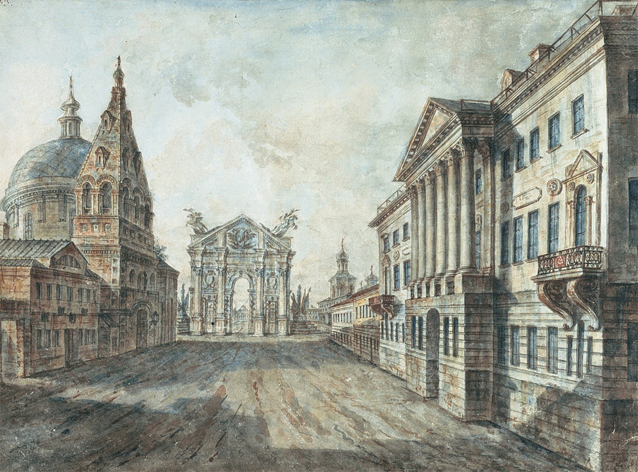 Вид Страстной площади с Триумфальными воротами, церковью Дмитрия Солунского и домом Козицкой. 1800-1802 гг. Акварель Ф.Я.Алексеева Фото: hist.msu.ru