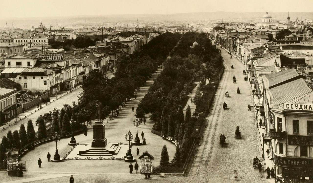1888 год. Вид на Тверской бульвар с колокольни Страстного монастыря. Фотогравюра Шерер, Набгольц и Ко. Москва. Соборы, монастыри и церкви. Изд. Найденов Фото: hist.msu.ru