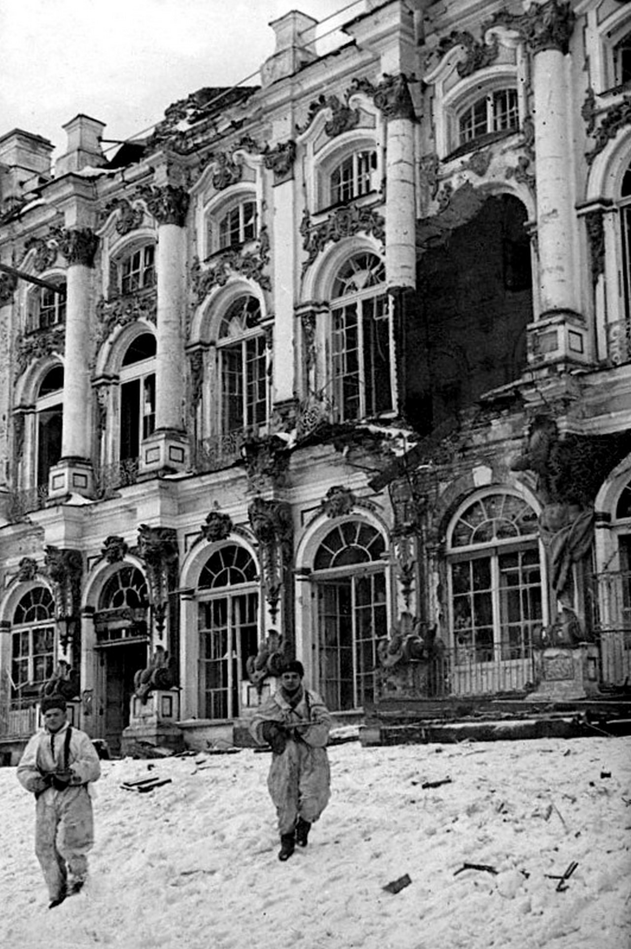 Пушкин, ранее носивший имя Царское Село, был основан в 1710 году как императорская загородная резиденция. Несмотря на эвакуацию ценностей, начавшуюся в первый же день войны, оказались утеряны 52 тысячи предметов. В городе были совершенно разграблены и разрушены пожарами и артобстрелами Екатерининский и Александровский дворцы.
