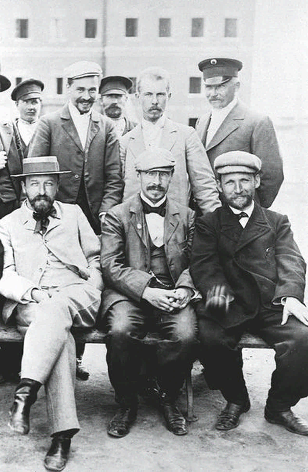 Д. П. Сухов (сидит справа) с коллегами С. У. Соловьёвым (сидит слева) и Н. Н. Благовещенским (в центре). Фото начала XX века