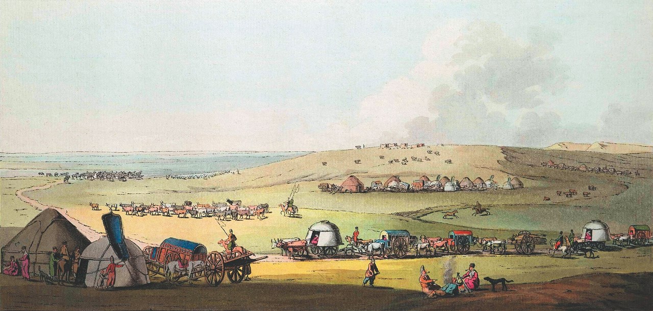 Калмыцкая орда, кочующая по берегам реки Ахтубы. Г.Х. Готлиб, раскрашенная гравюра конца XVIII века.