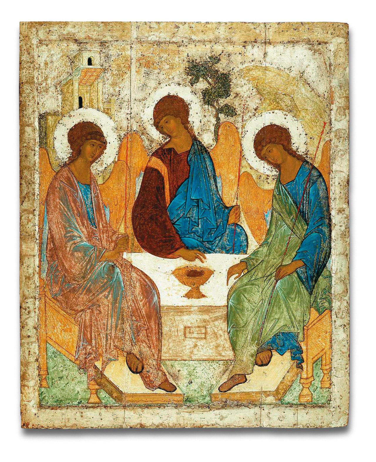 Цилиндрическое здание клуба в виде скоции по очертаниям близко к изображению чаши с головой агнца в центре рублевской иконы. Чаша в христианской традиции символизирует жертвенное служение, как и это здание в композиции НКТП. Единение вздымающихся к небесам башен-столпов, готовность к жертвенному служению – сакральный образ защитников страны.