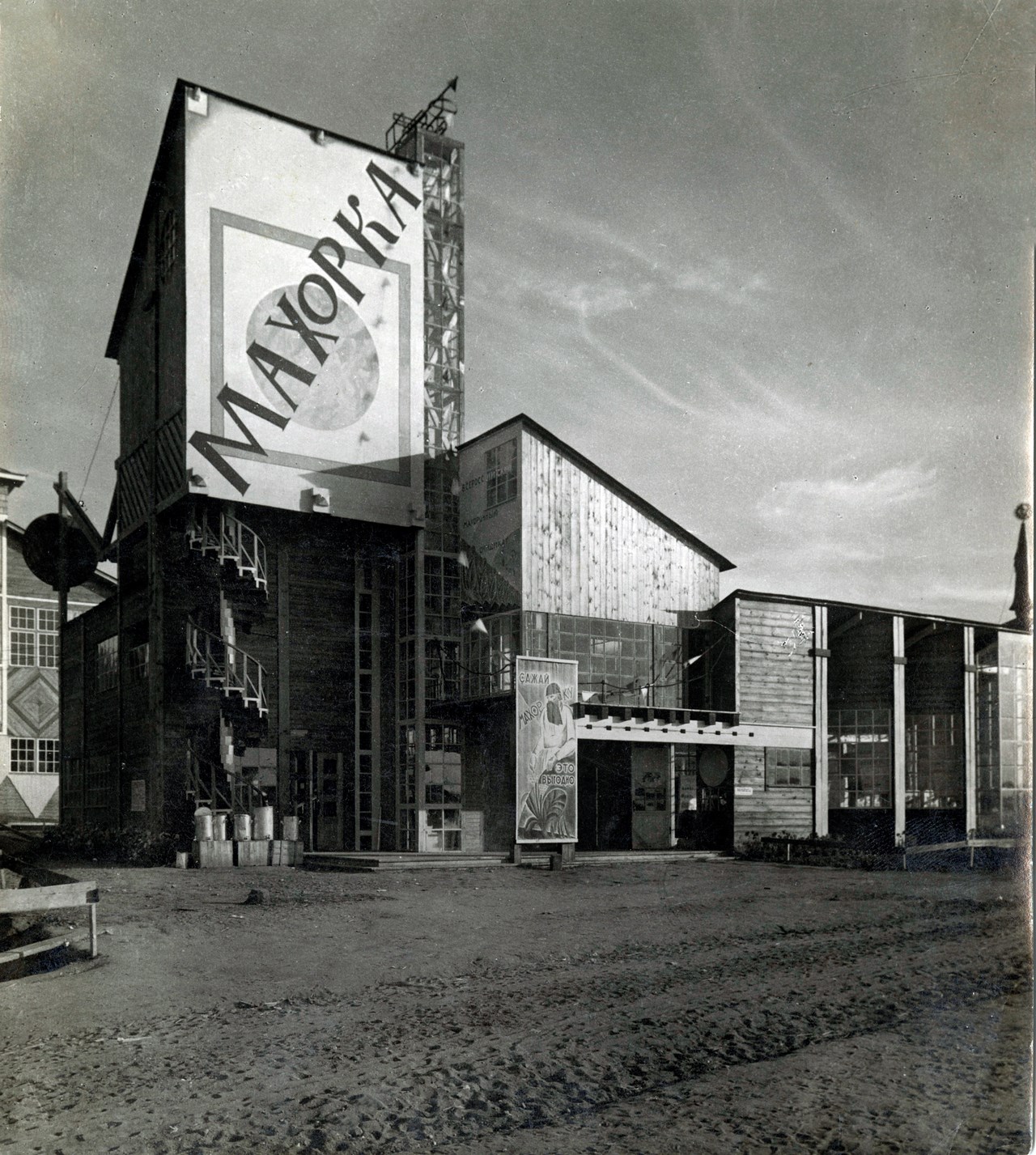 «…павильон Всероссийского махорочного синдиката на сельскохозяйственной и кустарно-промышленной выставке 1923 г. в Москве бесспорно был наиболее интересным архитектурным объектом выставки, в проектировании которой принимали участие виднейшие зодчие. Сложная динамическая композиция, консольные свесы, угловое остекление, открытая винтовая лестница, огромные плоскости плакатов – все это резко выделяло павильон "Махорка" из многочисленных построек выставки».