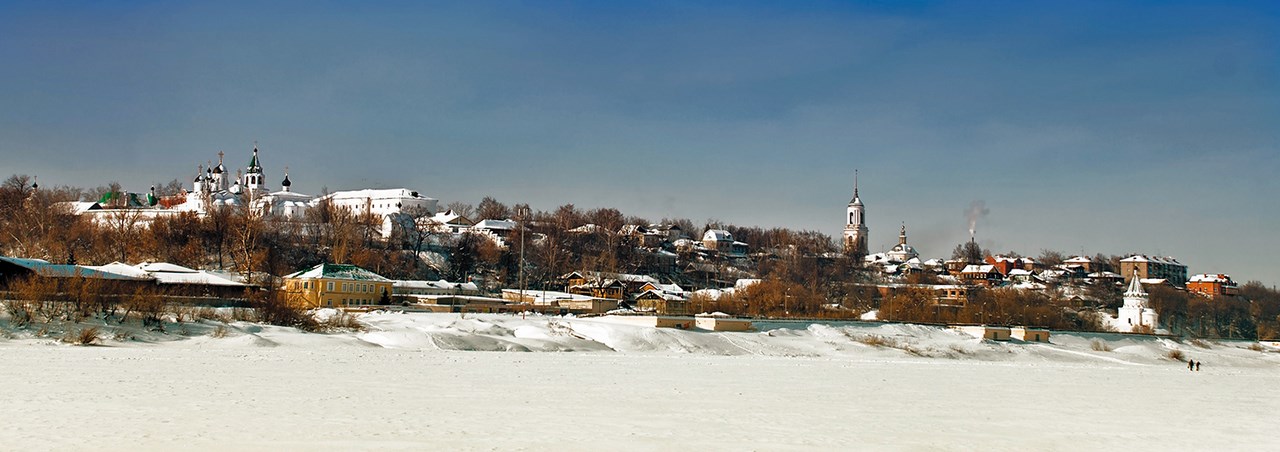 Панорама Гороховца с Пужаловой горы. Слева направо: Знаменский монастырь (1598 г.), дом купцов Канонникова и Опарина (оба – конец XVII века), Благовещенский собор (1770 г.)