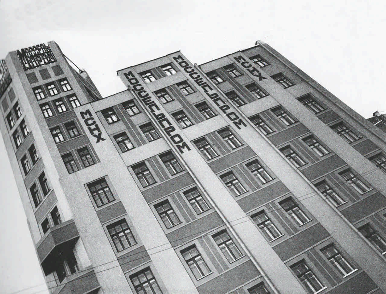 О.В. Лидер русского авангарда Константин Мельников в своем знаменитом доме-мастерской в Кривоарбатском переулке пытался объединить работу, творчество и быт. Здание круглой формы с множеством шестиугольных окон кажется небольшим, но те, кто был внутри, знают, что впечатление это обманчивое, дом Мельникова довольно просторный. В районе Арбата также можно увидеть первый советский небоскрёб в 7 - 9 этажей – здание Моссельпрома, расписанное Александром Родченко. В доме размещалась администрация московских продуктовых магазинов, склады, часть здания была жилой. Кроме лозунгов Маяковского, Родченко поместил на стене рекламные изображения: молоко и пиво «Друг желудка», конфеты «Мишка косолапый», папиросы «Герцеговина Флор». Конструктивизм сочетается с дизайном наружной рекламы.