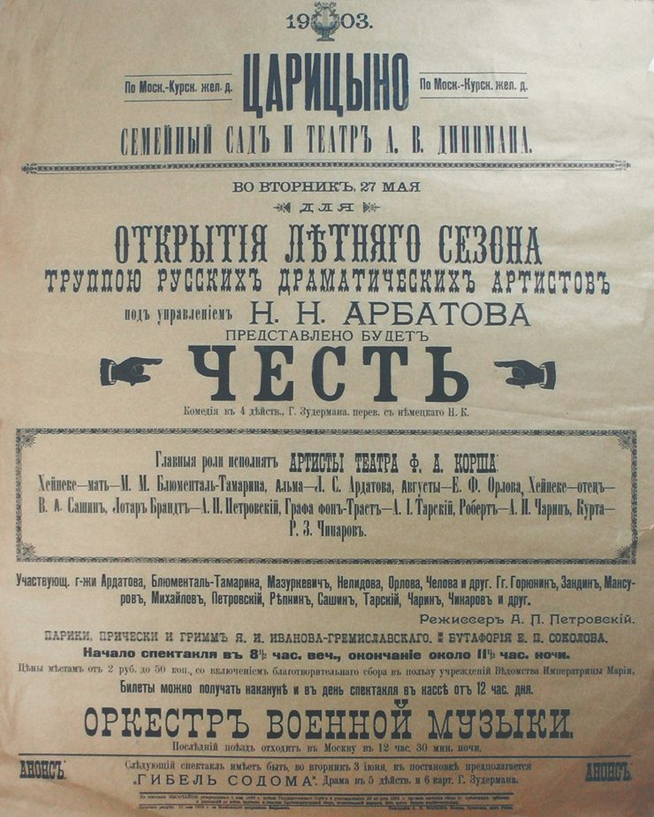 После Щеглова с 1883 года на протяжении около 30 лет арендатором участка театра в Царицино был Б. Диппман, которому контрактом было разрешено иметь «летний увеселительный сад, а в дворцовых постройках ресторан и буфет для продажи крепких напитков, театр, жилые помещения и меблированные комнаты», лавку «с продажей жизненных продуктов, а также в саду и театре устраивать танцевальные вечера, спектакли, фейерверки и другие увеселения».