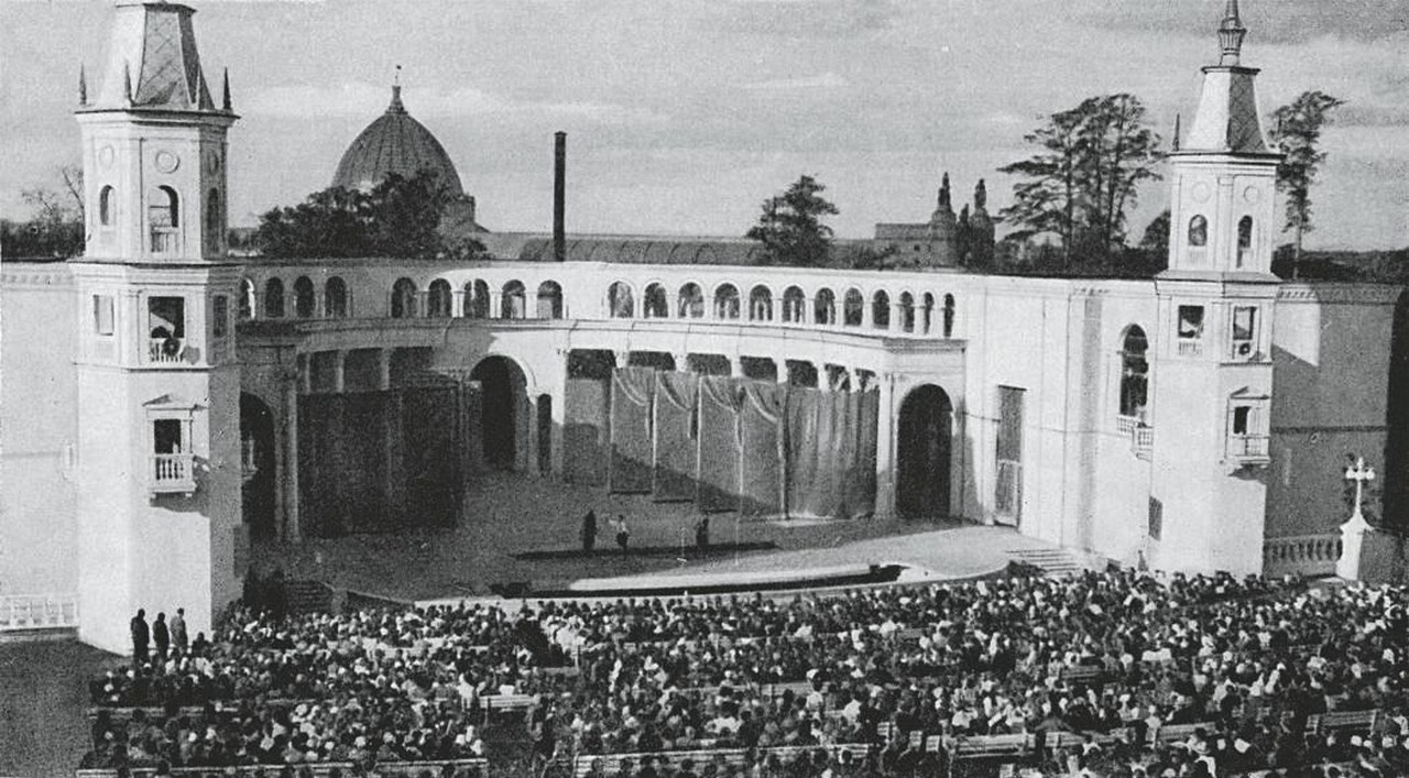 В 1939 году сцена театра представляла собой два двухэтажных корпуса, объединенных меж собой полуциркульной декоративной аркадой и расположенной по центру (в глубине) входной группой, игравшей роль кулис, из которых выходили артисты.