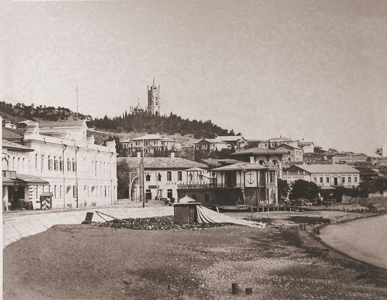 Ялта. Вид домов на набережной. На втором плане, на возвышении Поликуровского холма – колокольня собора Св.Иоанна Златоуста. Фото конца XIX века.