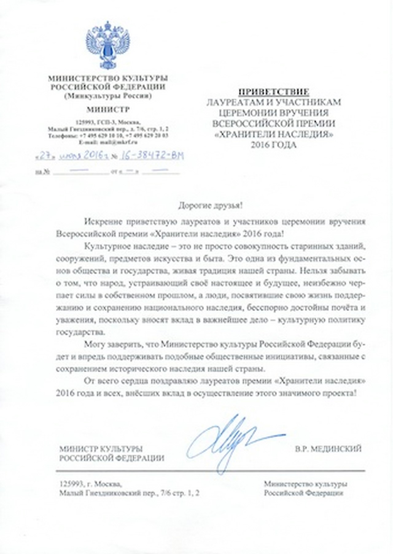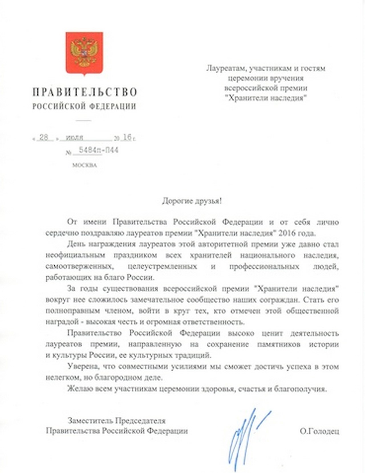 Участникам церемонии и лауреатам премии прислали приветствия: