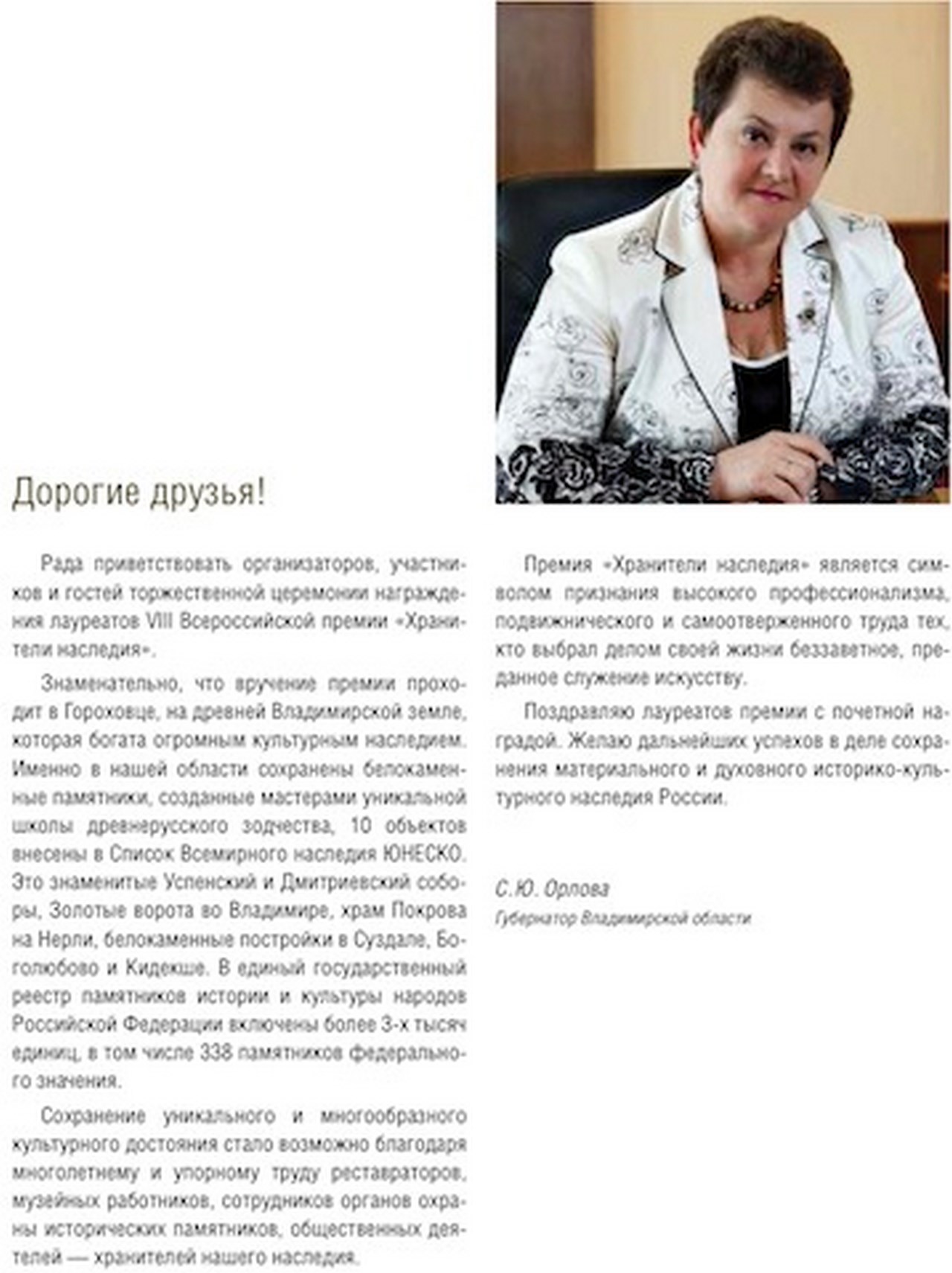 «Гороховец – неотъемлемая часть нашего культурного пространства, культурного пространства Руси и Владимирской Руси. Для нас большая честь принимать премию «Хранители наследия» на древней Владимирской земле. Сегодня в нашем реестре культурного достояния свыше 3000 памятников, в том числе 338 памятников федерального значения. В этом знаменательном ряду шедевры белокаменного зодчества, в том числе включенные в Список Всемирного наследия ЮНЕСКО: владимирские Золотые ворота, Успенский и Дмитриевский соборы, церковь Покрова на Нерли, замечательные образцы белокаменного зодчества в Суздале и Боголюбове. Сегодня перед церемонией мы поднимались на смотровую площадку у Никольского монастыря, откуда открывается вид на весь город: на купеческие дома, храмы, монастыри. И отчетливо встает образ города, сохранивший первозданное обаяние периода расцвета купечества. Из очертаний этих домов и храмов встает предвосхищение русского экономического чуда. Потому что именно купцы создали русского экономическое чудо на рубеже XIX-XX веков. Предвосхищение этого чуда ощущается здесь».