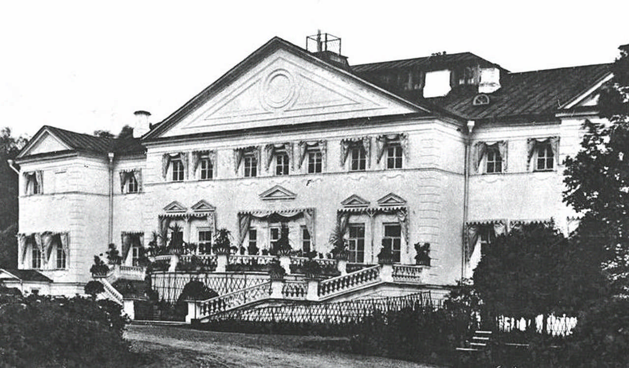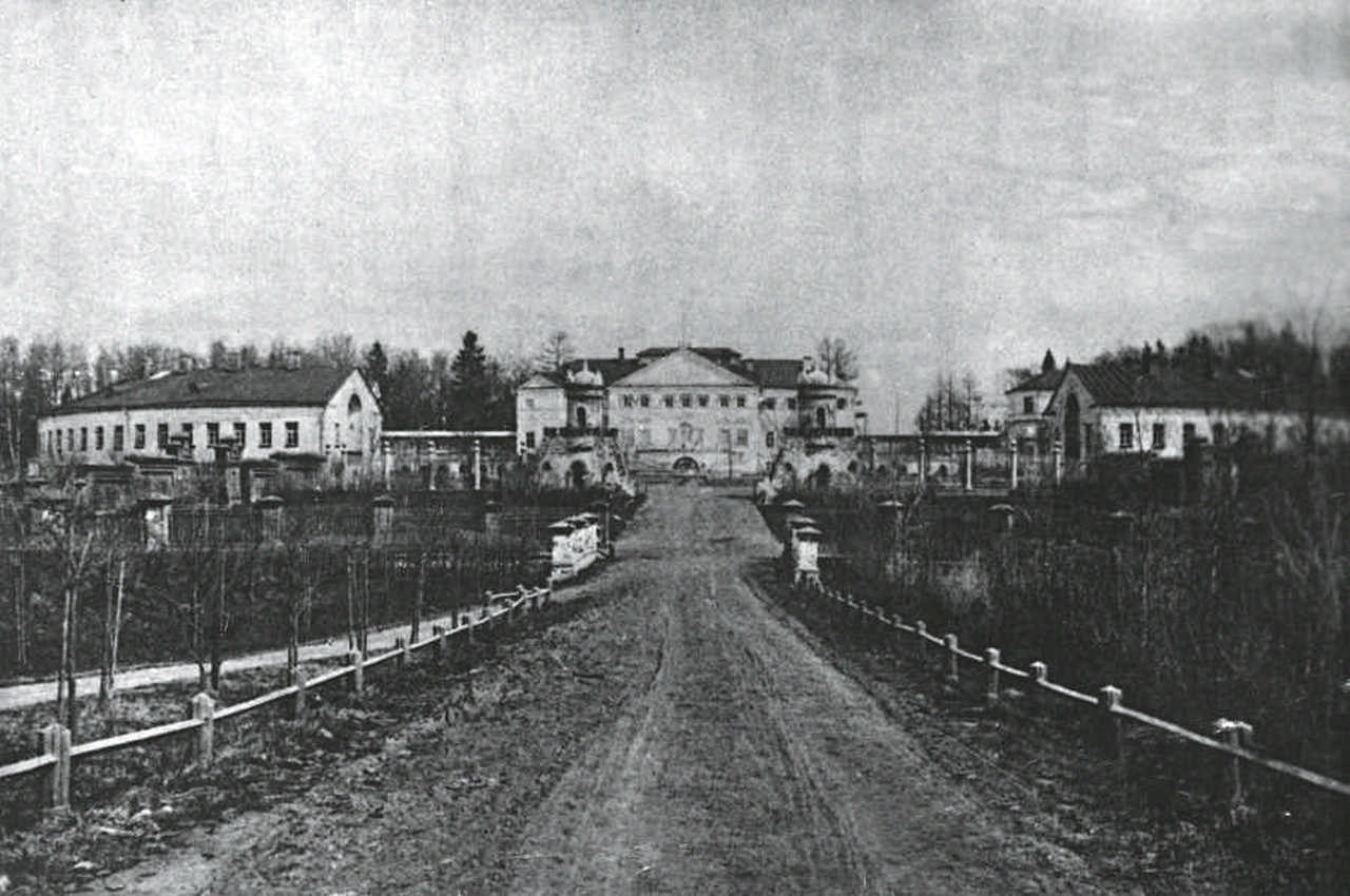 Фасад главного дома и въезд в усадьбу со стороны церкви. Фото начала XIX в.