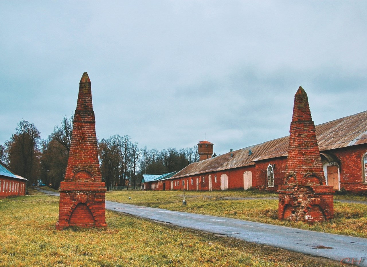 Въездные обелиски, конторские флигели, хозяйственные постройки конного двора и конюшня