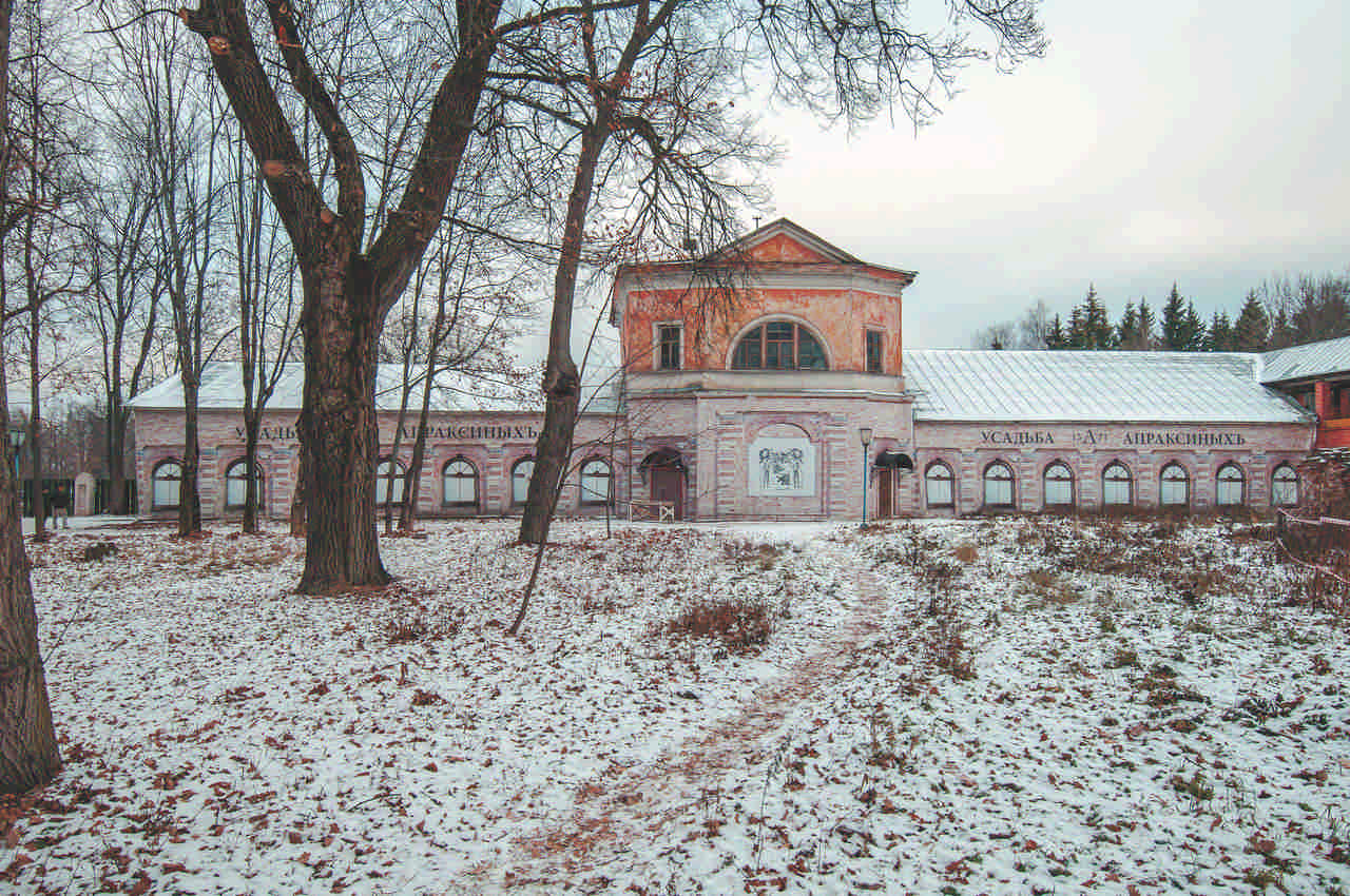 С севера к дворцу был пристроен флигель, в котором разместилась гордость графа Апраксина – его крепостной театр. Дворовые постройки и кухни завершали оформление главного двора. Въезд в него со стороны Введенской церкви оформили две кирпичные башни в готическом стиле. Въезды в саму усадьбу, расположенные у вершин организующих осей, были отмечены обелисками. К югу от дворцового комплекса расположилась развитая хозяйственная инфраструктура. Апраксинские конюшни стали местом разведения знаменитых орловских рысаков. Здесь же изготовляли кареты. Неподалеку находились фабрики – суконная, бумажная, ковровое производство и кирпичный завод. Для обслуживания этого хозяйственного комплекса Апраксины держали дворовой штат в 1000 человек. Это был настоящий город, выстроенный в одной архитектурной стилистике.