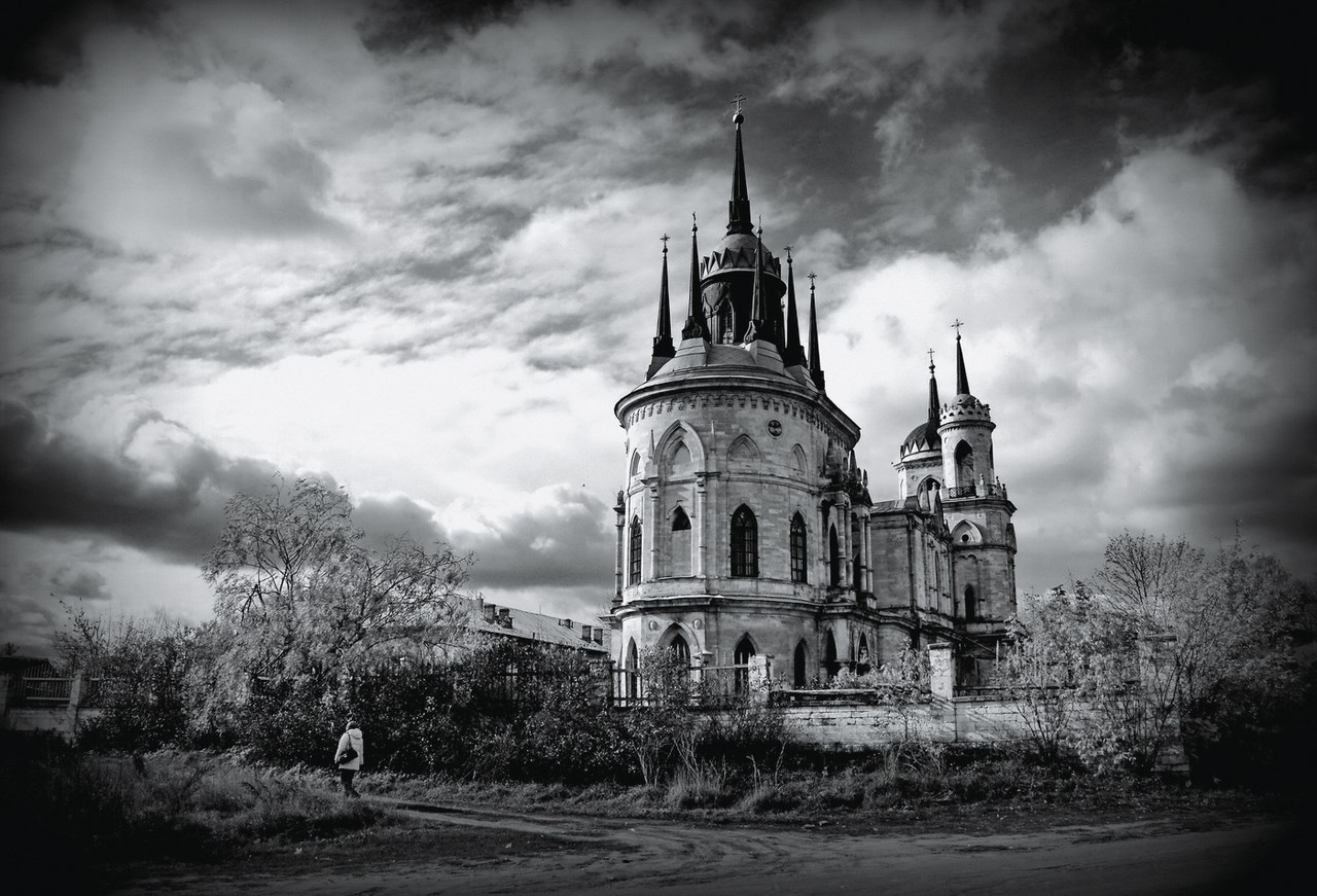 Но вот откуда-то из-за крыш черные шпили прорывают холст неба. Поначалу кажется, что это раскидистые, суковатые руки яблони или осины. Но штыковая прямизна их словно выгравирована. Храм поднимается из темного хаоса веток, сумеречных теней, сугробов, омута сараев, гаражей, коттеджей, как просыпается утро. Каменные, мышиного цвета стены, островерхие башни, круглый, пожалуй, даже тучноватый, барабан храма. Но сочетание ажурной окантовки, коронующей главный купол, стрельчатые, словно лучащиеся, шпили возносят церковь над каменным пленом. Она, словно размноженное треугольными гранями отражение в зеркалах. Парит, убегая от слов, линейности, объема, веса. Она недостижима, невесома, как улыбка весны. Она, как росчерк. Небрежный, случайный, тревожный и в то же время с твердо прочерченным на фоне багровеющего к вечеру неба силуэтом. В силуэте – средневековая, зловещая тайна готического замка, какого-то надрывного крика, недосказанности, вздоха, порыва, стремящегося оборвать стропы, улететь, но стреноженного, пойманного. Колокольня строгая, как грифель.