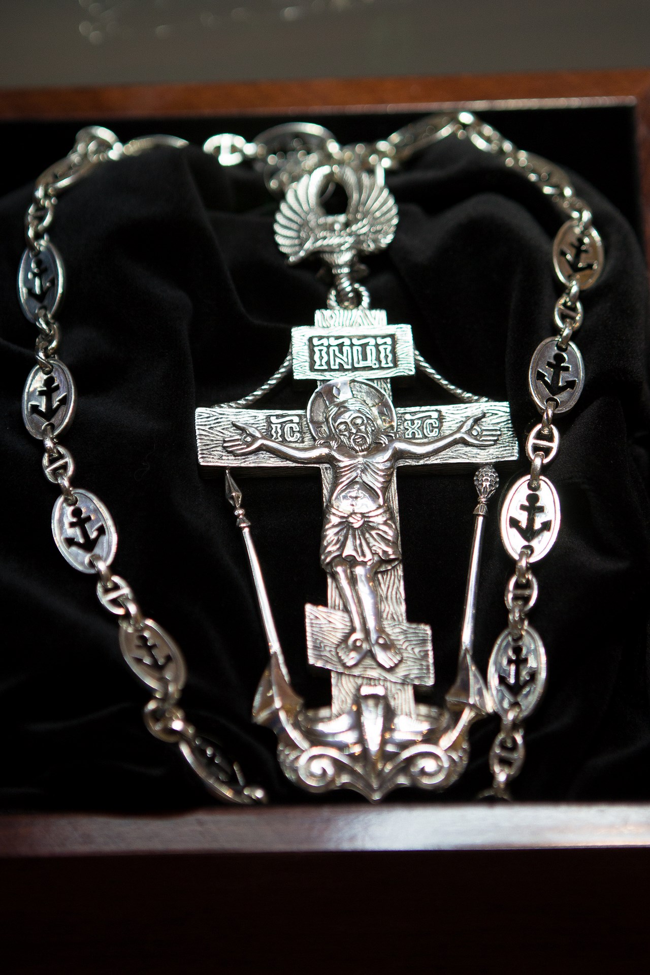 Канонический образ креста включает в себя традиционную морскую символику: якорь, ладью, канаты. Крест венчает голубь с оливковой ветвью, который согласно Евангельским представлениям являет собой образ новой жизни на земле после потопа. Голубь – важный символ для моряков, знак того, что близок берег и отчий дом. Крест был изготовлен по просьбе Федора Конюхова – иерея, священника, известного художника и путешественника, к которому обратились священники с крейсера «Варяг» с пожеланием сделать особый знак отличия. Непосредственно в рамках работы выставки Владимир Михайлов вручил священнический крест батюшке.